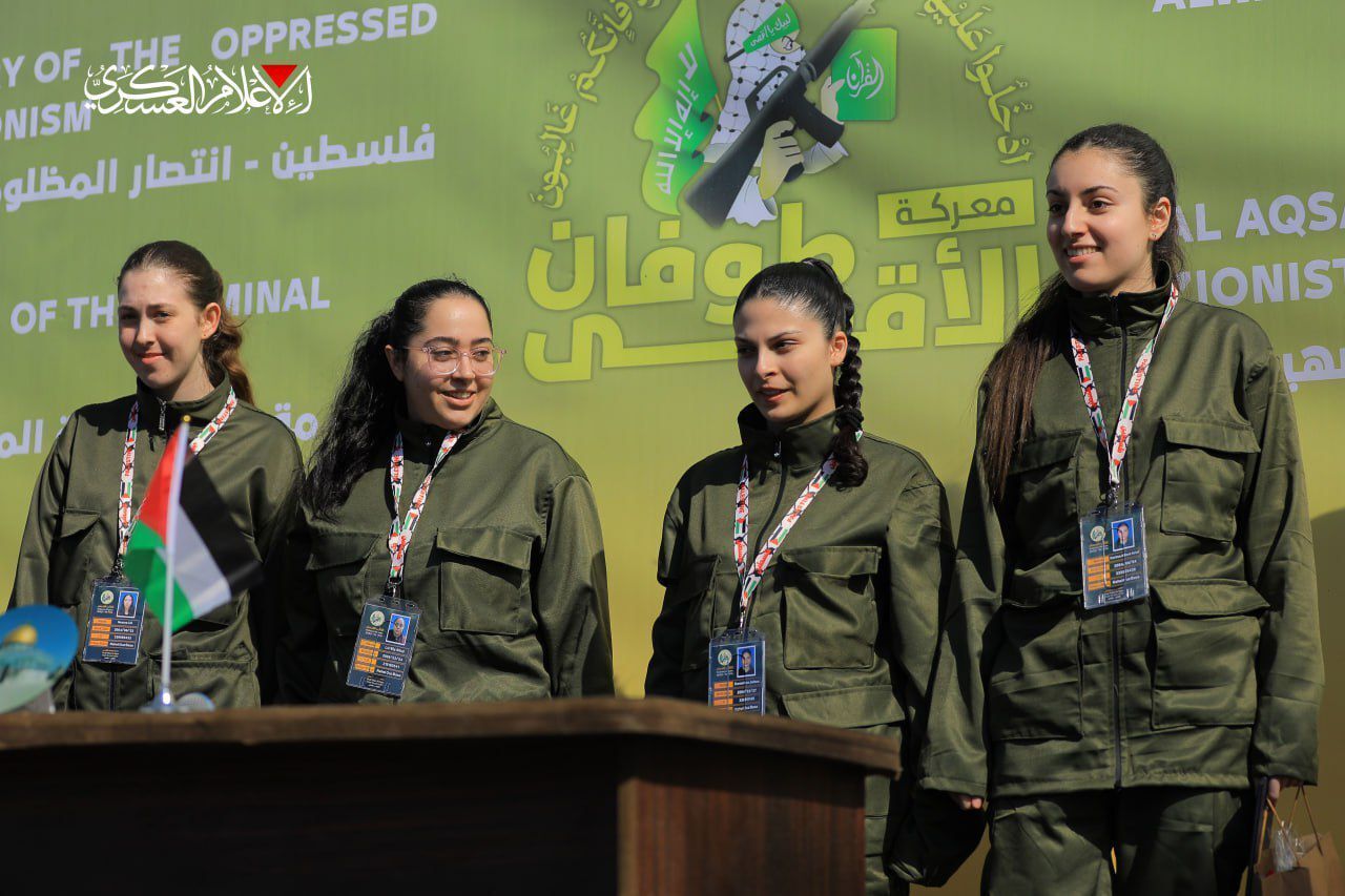 Üzerlerinde askeri üniforma ve boyunlarına asılı yaka kartlarıyla sahneye çıkan 4 İsrailli kadın esir asker, gülümseyerek burada bekleyenleri selamladı.