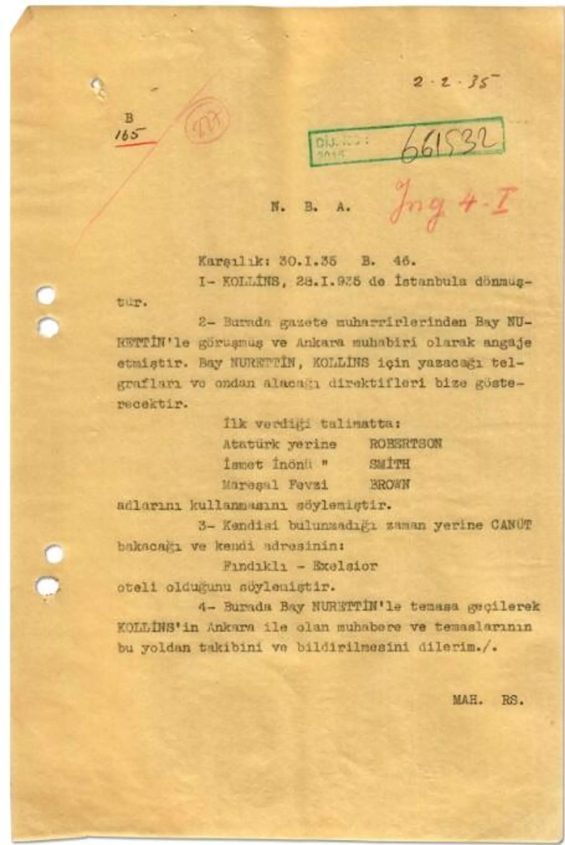 Raporda Times muhabiri Collins'in 28 Ocak 1935'te İstanbul'a döndüğü bilgisi yer alırken İstanbul'da irtibat kurduğu Nurettin ismindeki şahsın Collins için yazacağı telgrafları ve alacağı direktifleri MAH teşkilatına ileteceği bilgisi yer aldı.