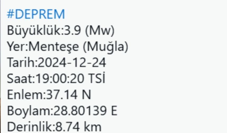 Muğla Menteşe'de 3.9 büyüklüğünde bir deprem meydana geldi. Deprem çevre illerden de hissedildi. AFAD depremi sosyal medya hesabından duyurdu. Son dakika haberinin detayları birazdan...